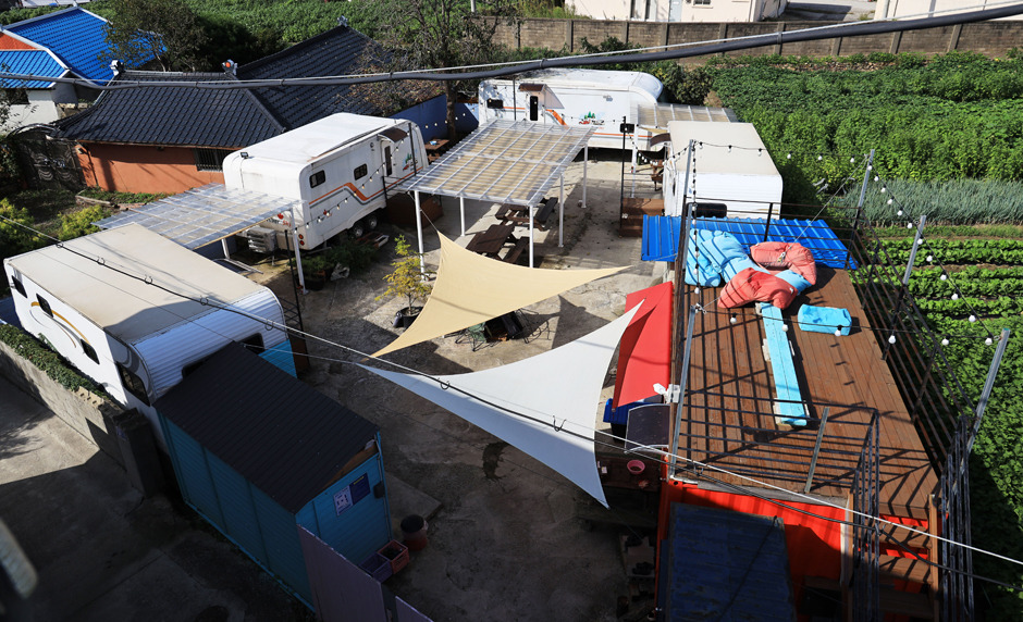 정동진에서 헌화를 지나면 금진항과 옥계 해수욕장에 닿는다. 서핑 장소로 주목받고 있는 옥계 해수욕장 중간 금진리 마을 안쪽에 캠핑장이 있다. 금진해변 가운데 공용주차장 뒤편이다. 캠핑장은 도로변 민박 건물 뒤편에 가정집처럼 꾸며져 있다. 4대의 카라반이 마당을 가운데 두고 배치되어 있고, 야외 테이블과 바비큐 시설이 각각 갖춰져 있다. 캠핑장에서 해변이 바로 보이진 않지만, 도보로 1분이면 닿을 수 있는 거리다.