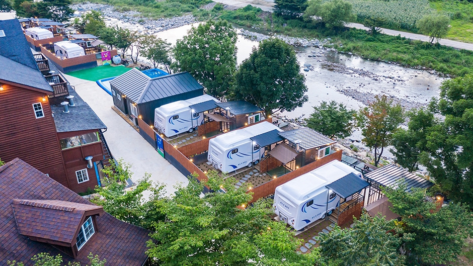 하늘땅카라반은 전북 무주군 설천면 삼공리에 자리 잡았다. 무주군청을 기점으로 25km가량 떨어졌다. 자동차를 타고 무주로와 구천동로를 번갈아 달리면 닿는다. 도착까지 걸리는 시간은 25분 안팎이다. 캠핑장이 계곡에 위치한 덕분에 물놀이로 한여름 무더위를 날리기 그만이다. 게다가 산으로 둘러싸여 있어 더없이 자연친화적이다. 캠핑장에는 카라반 6대가 마련돼 있다. 내부에는 침대, TV, 테이블, 개수대, 취사도구, 조리도구, 화장실, 샤워실 등 일상생활이 가능할 정도의 시설이 완비돼 있다. 야간에 경관 조명이 켜지면 낭만적인 분위기를 연출한다. 부대시설로는 펜션, 수영장 등이 있다. 주변에는 무주 덕유산리조트 스키장, 덕유산자연휴양림 등 무주를 대표하는 관광지가 즐비하다.