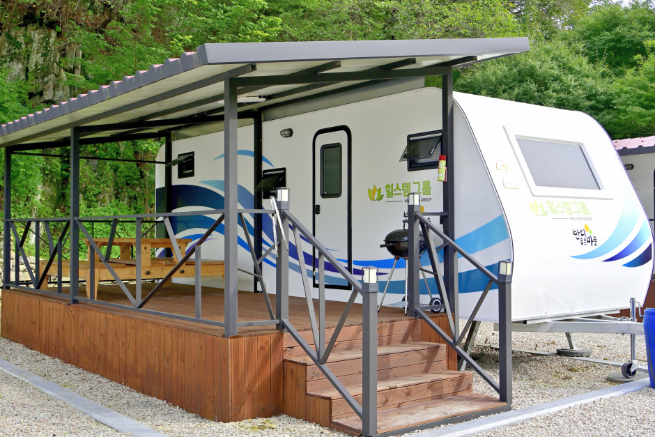 반디 품은 마을 캠핑장은 원래 무주 된장공장이 있던 곳이었는데, 공장이 문을 닫은 이후 야영장을 조성하고 카라반을 설치하면서 만들어진 곳이다. 그래서 입구 옆 담벼락 안에는 장독대들이 줄을 지어 있어 한국의 토속적인 풍경이 더욱 정감 가는 곳이다. 주변에 산과 개천이 있어 공기가 청명하다. 매점, 야외 훈제장, 수영장, 트램펄린 등이 있고 총 14대의 카라반이 있다. 주변에 타프나 텐트 설치도 가능하다. 카라반은 이중으로 된 문과 창문이 달려있다. 방충망도 달려 있어 산속 벌레 걱정이 없다, 카라반 내부는 원목을 사용하여 편백나무 향기가 가득하다. 테이블, 에어컨, 침대가 있고 주방에는 싱크대, 냉장고, 전자레인지, 전기포트, 미니밥솥 등 요리에 필요한 주방 가전이 갖춰져 있다. 열차 안에서 마주 앉아 음식을 즐기는 카페테리아 느낌으로 내부에서나 바깥 테라스에서나 어디에서도 분위기를 낼 수 있다. 화장실도 세면대, 샤워호스, 변기가 깨끗하게 관리되고 있어서 나만의 카라반 안에서 가족, 친구, 연인과 오붓한 시간을 보낼 수 있다.