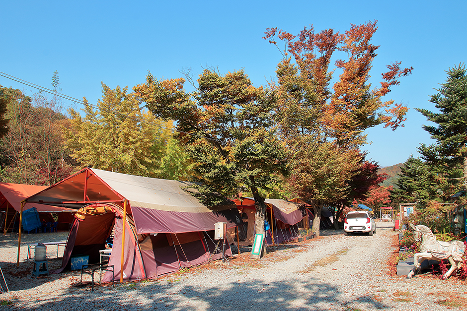 경기도 가평군 설악면에 위치한 이지 캠핑장은 37번 국도변에 있지만 숲을 배경으로 잘 정비돼 있어 서울에서도 찾는 캠퍼들이 많다. 오토캠핑 18면, 글램핑 26면을 갖춘 캠핑장은 사이트마다 타프를 설치해 텐트존 외에 하나의 공간을 더 사용할 수 있다는 장점이 있다. 글램핑은 카바나가 아닌 대형 텐트로 완성했지만 테이블, 의자, 조리기구, 식기세트, 아이스박스 등을 갖춰 불편을 없앴고 각 사이트 사이에는 은행나무를 심어 경계를 확실히 했다. 캠핑장 곳곳에는 에일리언, 인디언 등의 조형물을 배치해 기념사진을 남길 수 있게 배려했고 어린이를 위한 놀이터와 수영장, 무대가 있다.
