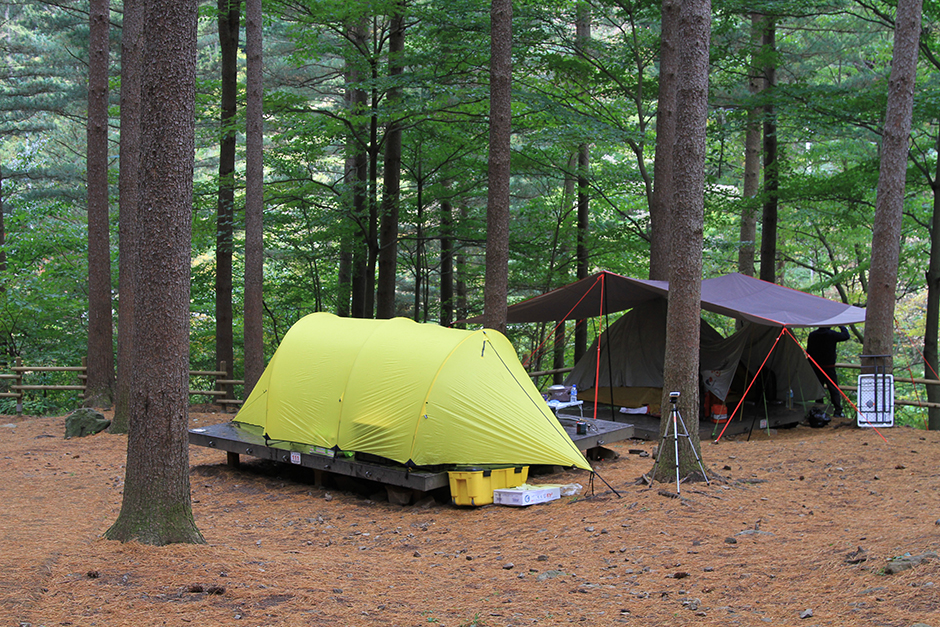 캠핑장은 산림문화휴양관과 잔디마당, 숙박동을 지나 맨 안쪽에 있다. 울창한 낙엽송 숲속에 28개의 데크와 온수가 나오는 샤워실, 세척대가 갖춰져 있다. 캠핑장 앞으로 작은 계곡이 흘러 물놀이도 할 수 있고 시원함을 더해준다. 계곡 건너편에 주차하고 짐을 옮겨야 하는 불편은 있지만 조용하고 인공적인 가공이 적은 캠핑장으로 인기가 높다.