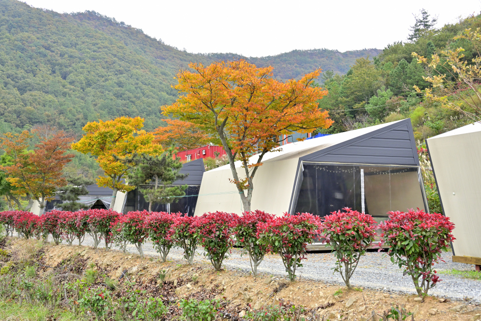 2020년 5월에 개장한 큐브 빌리지는 산 중턱에 자리 잡은 글램핑장이다. 객실 바로 앞에 주차를 할 수 있는 편리함이 장점인 큐브 빌리지는 총 9개의 글램핑 큐브 존과 텐트 형식의 5개 빌리지 존이 있고 수영장, 탁구장, 족구장, 공용화장실과 샤워실, 매점, 어린이 놀이방, 트램펄린 등이 있다. TV는 없지만 수건과 어메니티(치약, 칫솔, 폼클렌징, 바디 워시), 손소독제, 디퓨저, 모기약, 헤어드라이어, 냉장고, 전자레인지, 밥솥, 전기포트, 인덕션, 쓰레기봉투, 목장갑 등이 비치되어 있다. 바비큐는 사전에 얘기하면 시간 맞춰 불을 피워준다, 기본적으로 필요한 모든 것들이 준비되어 있어 급하게 떠나온 여행도 여유 있고 편하게 즐길 수 있다. 큐브 빌리지 안에서 물놀이도 하고 탁구도 치고 고기도 구워 먹을 수 있으니 자연 안에서 소중한 사람과 추억 만들기 좋다. 단 반려동물은 입장을 금지하고 있다.