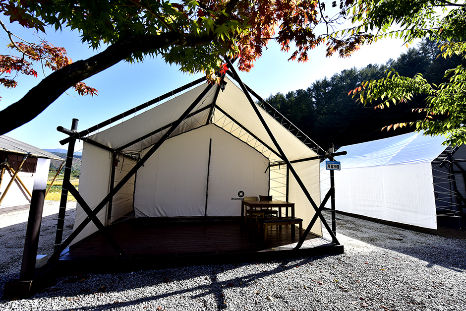 캠핑장은 사이트 30개 동이 넓은 지역에 분포해 있어, 답답함이 없고 캠핑장 맞은편에는 일반 캠핑이 가능한 사이트를 함께 운영 중이다. 캠핑장 앞에는 화악천이 흐르고 있어 여름철엔 물놀이체험이 가능하다. 특히 이곳 글램핑 텐트는 방수 6000mm 이상, 방염 미국 CPAI-84기준, UV 95% 차단율을 자랑하는 국내 최고 스펙이다. 사이트 간의 거리도 적당해서 개인생활 보호에 좋고, 캠핑과 글램핑 두 가지 방식의 사이트를 운영해 이용자의 선택을 돕고 있다.