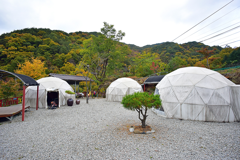 캠핑장내 돔형 글램핑 텐트는 모두 방염텐트로 되어 있어 좀 더 안전하게 캠핑을 즐길 수 있다. 내부시설로는 침대, 냉장고, 옷걸이, 선풍기, 가스버너, 취사도구 일체가 구비되어 있으며 글램핑 앞으로 개별 테라스와 바비큐파티를 할 수 있는 장비가 설치되어 있어 오붓한 식사를 할 수 있다. 화장실과 개수대 샤워장은 공용시설을 이용해야 한다.
