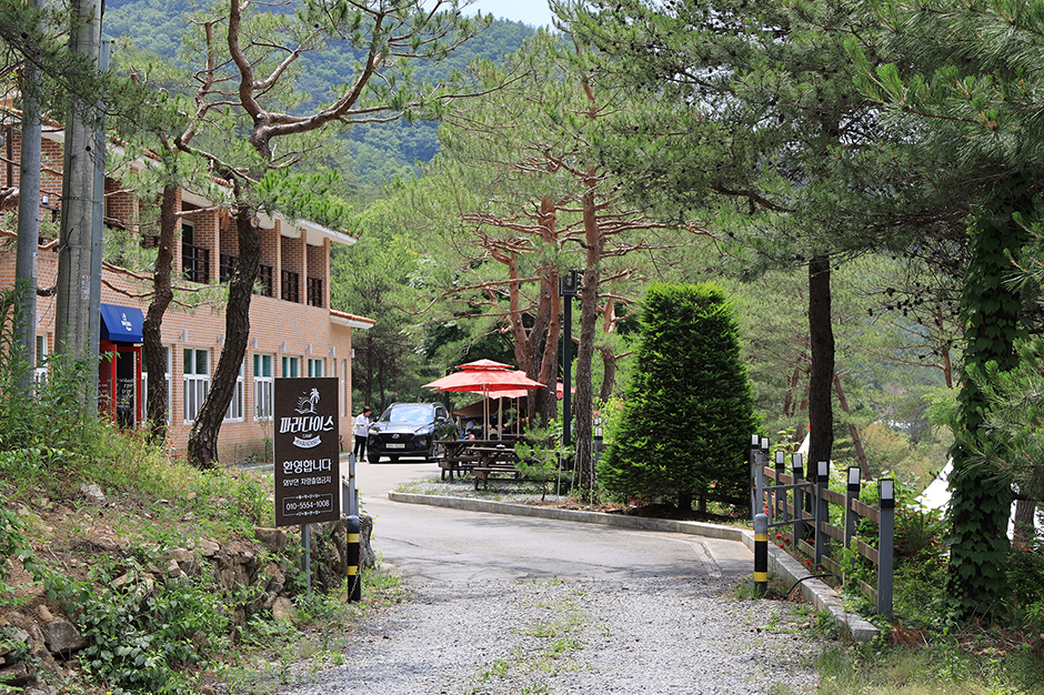 파라다이스 캠프는 캠핑의 성지로 유명한 영월 무릉도원면 법흥계곡 상류에 있다. 웰컴 투 파라다이스라는 간판이 강 입구에 크게 걸려있고, 다리를 건너가면 왼편이 웰컴투 캠프, 오른편이 파라다이스 캠핑장이다. 이 두 캠핑장은 사업자는 다르지만 마케팅과 브랜딩을 함께 만들어가고 있을뿐 아니라 고객들의 요구와 필요에 따라 장소도 서로 바꿔 연결해 주고 있다. 즉, 웰컴투 캠프는 아이들을 위한 수영장 시설이 아주 좋고, 파라다이스 캠프는 계곡과 소나무숲이 좋다. 이러한 환경을 서로 공유하는 것이다.