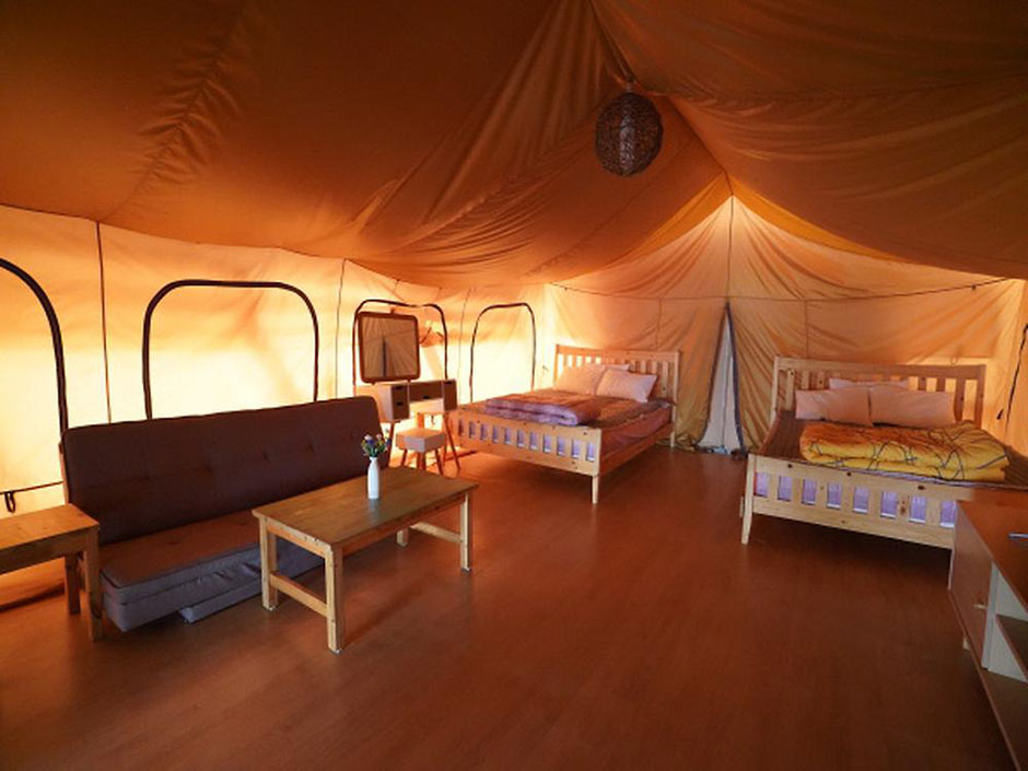 글램핑은 개별 씽크대와 화장실, 난방, 에어컨, 온수를 사용할 수 있고 준비물 없이 와도 1인 상차림과 정육식당, 셀프바베큐장이 있어 편리하게 캠핑을 즐길 수 있다.