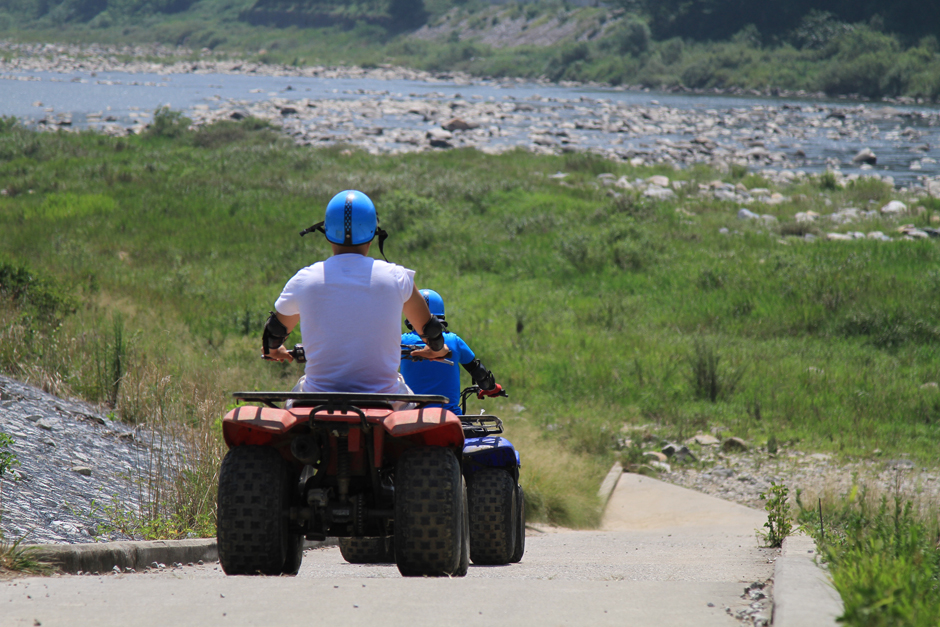 ATV란 ‘어떤 지형에서든 주행이 가능한 탈 것(All-Terrain Vehicle)’이란 말의 영문 머리글자를 조합해 만든 용어로, 길이 없는 오프로드(off road)에서도 주행할 수 있는 사륜차를 말한다. 그렇지만 조향장치, 조작방식, 동력전달방식 등은 오토바이와 흡사하다. 산청에는 AT 장이 세 곳 있다. 그중 가장 규모가 크고 오프 로드의 재미가 큰 곳이 옛 경호강 휴게소에 자리 잡은 엑스로드 ATV장이다. 지금은 영업하지 않는 휴게소가 전부 오프로드 연습장이다. 휴게소 마당에서 충분히 연습한 다음에는 강변으로 내려간다. 경호강을 따라 신나게 달리다 보면 온갖 시름이 달아난다.