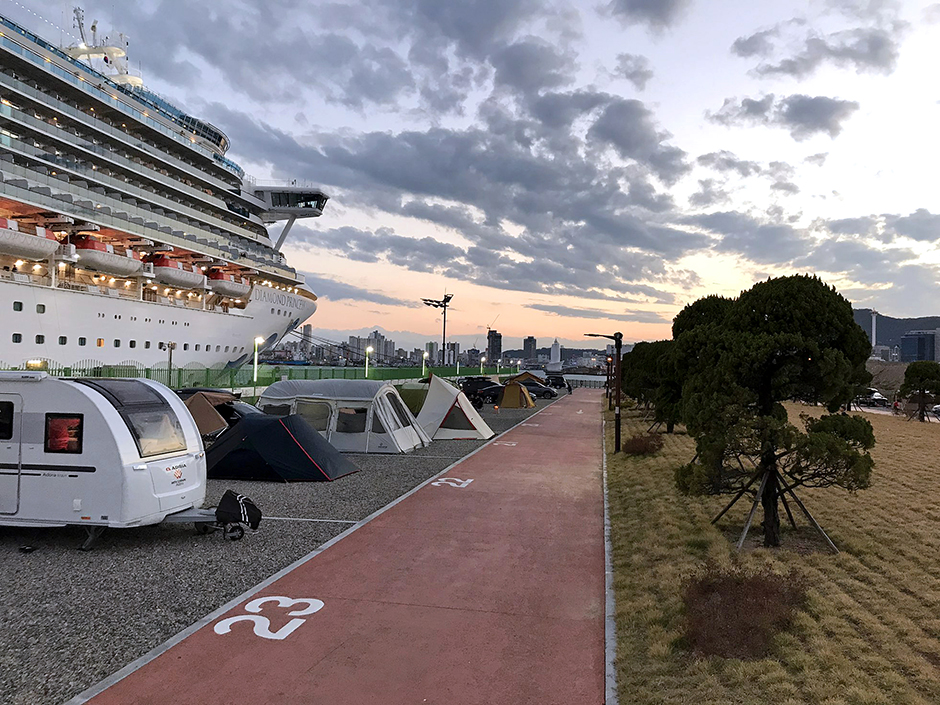 바다가보이는 부산항힐링야영장은 부산광역시 동구 초량동에 위치한 약 8,925㎡(2,700 평) 부지의 북항의 항구와 바다, 부산항 대교의 야경을 볼 수 있는 곳에 위치한 야영장이다. 부산항의 아름다운 밤 풍경을 볼 수 있고 사이트 크기가 비교적 넓어 가족 단위의 캠핑을 즐기기에 좋은 곳이다. 부산항 힐링야영장은 펜스 하나 사이로 어마어마한 대형 크루즈의 모습을 바로 가까이서 볼 수 있다. 담장 사이로 들뜬 외국 여행자와 텐트를 분주히 설치하는 엄마아빠와 어린이들, 국적은 알 수 없지만 행복한 표정으로 손 인사를 나누며 행복해 질 수 있는 곳이 이곳 부산항 힐링야영장만의 특징이다. 어린이들에게 색다른 캠핑의 추억을 안겨 줄 수 있는 곳. 부산항 힐링야영장은 텐트 바로 옆에 주차를 할 수 있어 짐을 옮기는 수고를 덜어준다. 배전함이 있어 릴선만 있으면 전기 사용이 가능하다. 밤에는 시설 내의 가로등 조명이 밝아 안전한 편이다. 농구대와 미니 도서관, 흔들의자, 수영장, 잔디구장이 있어 어린이들이 마음껏 뛰어놀기에 좋으며, 소외계층을 위한 야영 비품도 구비되어 있어 편리하게 이용할 수 있다.