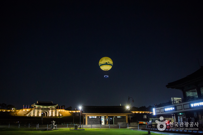 플라잉수원은 계류식 헬륨기구로 최대 150m 상공에서 수원 화성 전체를 조망할 수 있는 이색적인 관람시설이다. 계절마다 새로운 매력의 수원화성을 하늘과 맞닿아 감상할 수 있다. 가족, 친구 혹은 연인과 함께 멋지고 특별한 추억이 될 것이다. 헬륨기구는 최대 30명까지 탑승 가능하며 승객의 안전을 위해 잘 훈련된 파일럿이 동승한다. 또한 기낭 유럽 항공 안전국 규정 통과, 프랑스 보건국 안전 공인 완료 등 안전성이 검증된 관람시설이다.