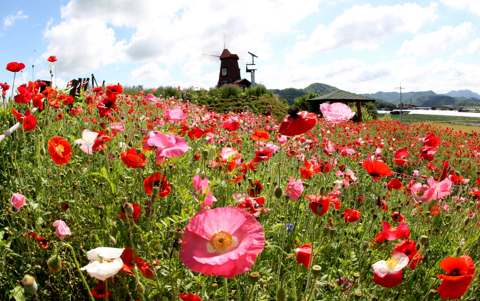 악양둑방은 함안군이 자연재해 방지를 위해 축조한 둑방으로 계절마다 각기 다른 꽃들을 심어 다양한 풍경을 자아내고 있다. 특히 봄에는 흰 안개꽃 사이에 피어난 꽃양귀비가 화려한 자태를 뽐내고 남강의 바람에 물결치는 장관을 연출한다. 둑을 따라 탁 트인 길옆으로 붉은 양귀비가 너울거린다. 중앙에는 국내에서 보기 드문 빨간 풍차가 있고, 날씨가 좋을 땐 꽃밭 위로 날아가는 경비행기를 볼 수 있어 이색적이다. 꽃이 피어 있는 구간의 길이는 2.7km 정도이며, 왕복 소요 시간은 넉넉히 2시간 안팎이다. 둑방 아래에는 함안군을 둘러볼 수 있는 경비행기를 운영하며 남강 너머 기암절벽에는 악양루가 보인다. 악양루는 중국의 명승지인 ‘악양’의 이름을 따서 지은 정자다. 마을 북쪽 절벽에 있으며 유유히 흐르는 남강과 넓은 들판, 붉게 물든 둑방길을 한눈에 조망할 수 있는 공간이다.