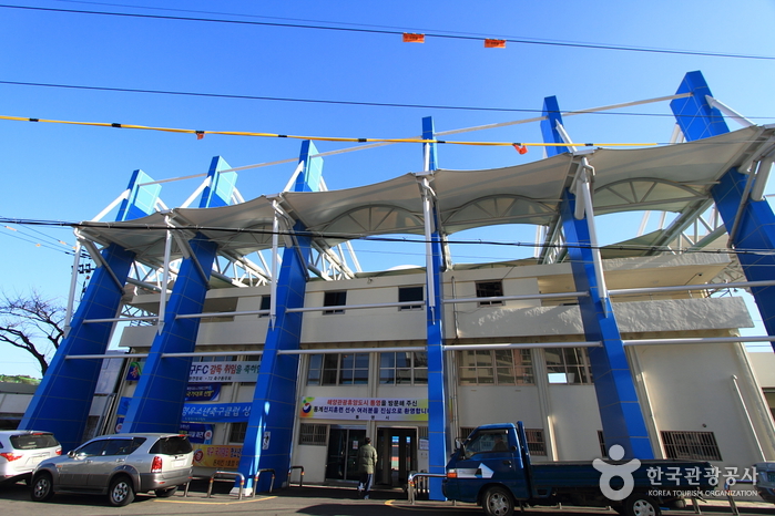 통영시민들의 여가활용을 위하여 만들어 놓은 공설운동장이다. 육상공인 3종경기장 시설이 완비되어 있는 곳이다. 통영컵국제축구경기도 매해 열리는 곳이다. 잔디구장이 마련되어 있어 어린 축구선수들의 연습장으로도 넓게 활용되고 있다. 문화와 예술의 고장 통영에서 잔디시설까지 갖춘 국제규모의 축구장을 보니 통영의 앞바다가 더욱 더 넓어 보인다.