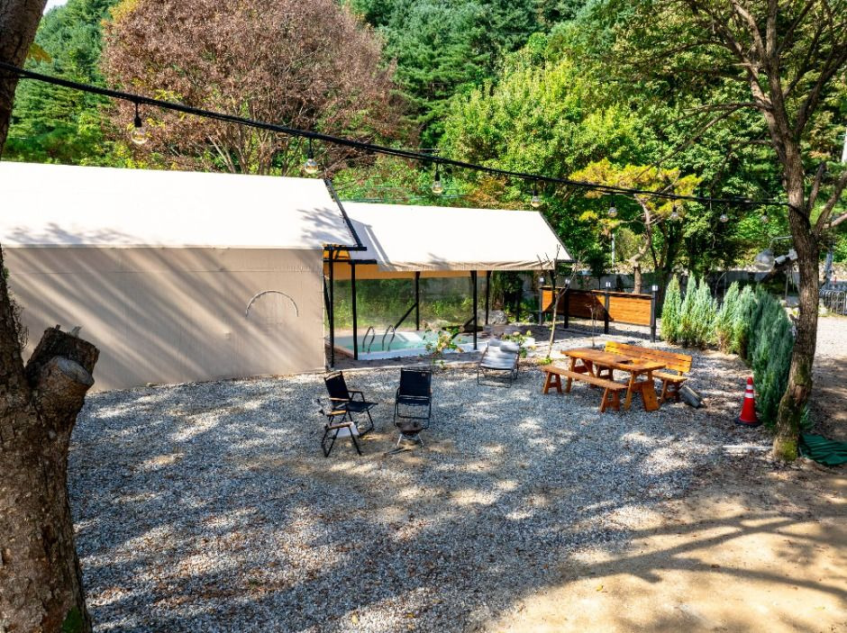경기도 가평군에 위치한 이곳은 숲 속에 위치해 있어서 편안하게 휴식을 취하기 좋다. 개별 수영장이 구비되어 있어서 다른 사람들의 방해 없이 개인공간에서 수영과 휴식이 가능하다. 이곳은 불멍이 가능하며 숯불세트가 준비되어 있다. 또한 글램핑뿐만 아니라 독채로 구성된 풀빌라도 있어서 편하게 풀램핑을 즐길 수 있다.