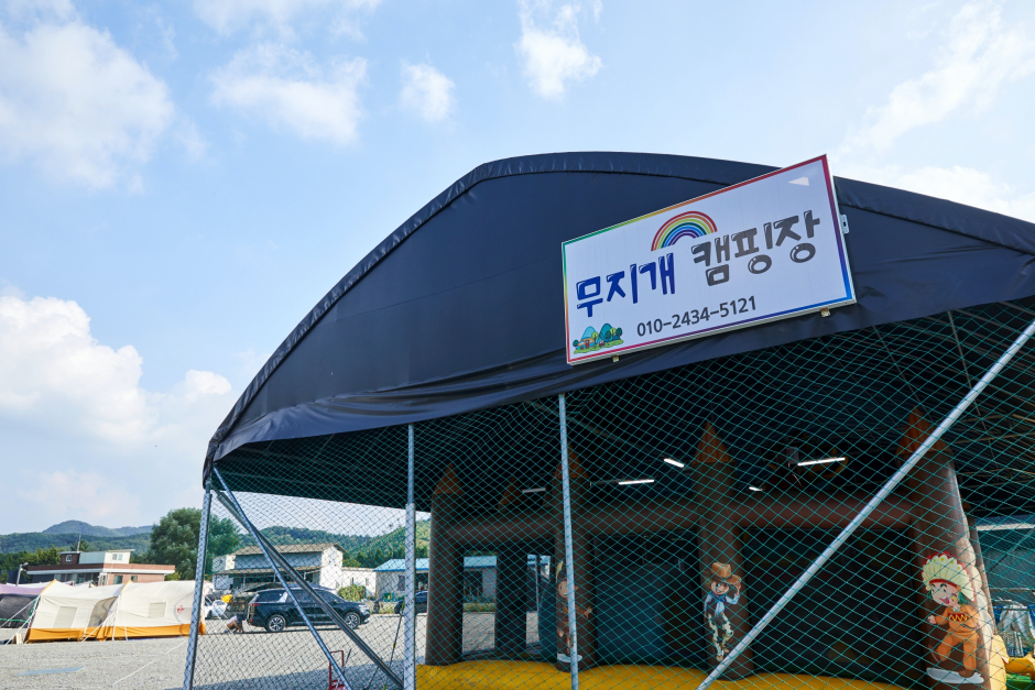 파주 광탄면에 자리하고 있는 무지개 캠핑장은 서울에서 1~2시간이면 올 수 있는 거리로 근교에 자리 잡아 접근성이 좋은 캠핑장이다. 아이들을 위한 커다란 에어바운스 시설이 있어 자녀가 있는 캠핑족들에게는 키즈 캠핑장으로 입소문이 난 곳이다. 캠핑장은 총 17개의 사이트가 있으며, 모든 사이트가 6 x 7m 사이즈의 파쇄석으로 이루어져 있다. 사이트 크기 이내라면 텐트뿐만 아니라 트레일러, 카라반, 캠핑카, 차박도 가능하다. 다만, 캠핑장 내부에 나무가 없어서 그늘이 없으니 햇빛이 강한 한낮에는 더위를 피할 캠핑 장비를 챙겨가는 것이 좋다.