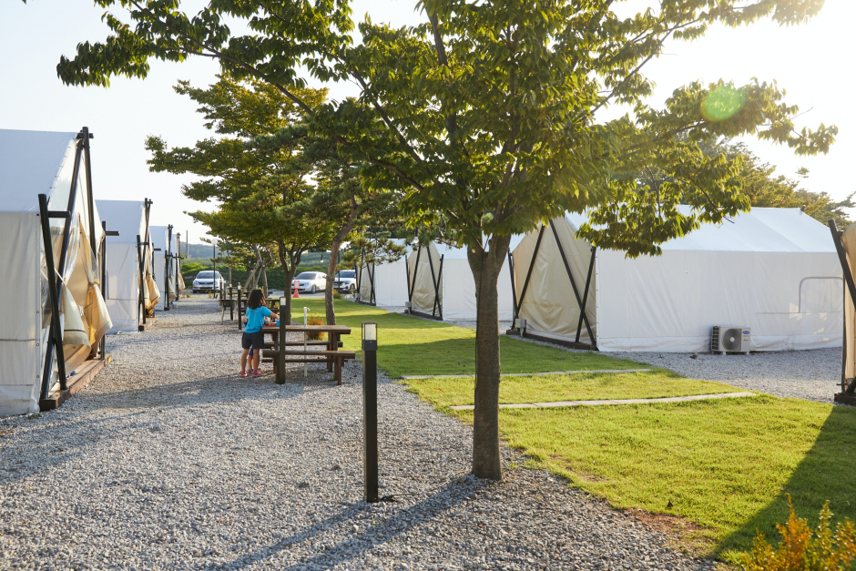 노을빛 바다애 글램핑은 세계 자연문화유산인 너른 서해 갯벌을 마주하고 있어 아름다운 풍경을 자랑하는 곳이다. 다양한 생물을 만나볼 수 있는 갯벌체험과 바다 너머로 떨어지는 석양이 글램핑의 묘미를 더해준다. 총 14개의 글램핑 텐트를 운영하는데, 가장 안쪽 관리동 쪽이 바다 라인, 가운뎃줄이 빛 라인, 바다 가장 앞쪽이 노을 라인으로 나뉘어 있다. 바다 1, 2와 노을 1 ~ 5객실의 경우 바다와 바로 닿아있어 바다 내음과 파도 소리, 멀리 어선이 노을에 일렁이는 모습까지 그대로 볼 수 있다. 나머지 바다 3, 4와 빛 1~5객실 역시 앞 글램핑 구역과 지그재그로 배치돼있어 바다 풍경을 감상할 수 있게 되어있다. 여름에는 깨끗한 수질로 운영되는 수영장이 있어 물놀이가 가능하며, 글램핑 텐트마다 앞에 설치된 테이블에서 편리하게 바비큐 파티를 즐길 수 있다. 세척실 역시 깨끗하게 유지되고 있으며, 남녀 분리된 샤워실과 화장실도 넓고 청결하게 관리되고 있다