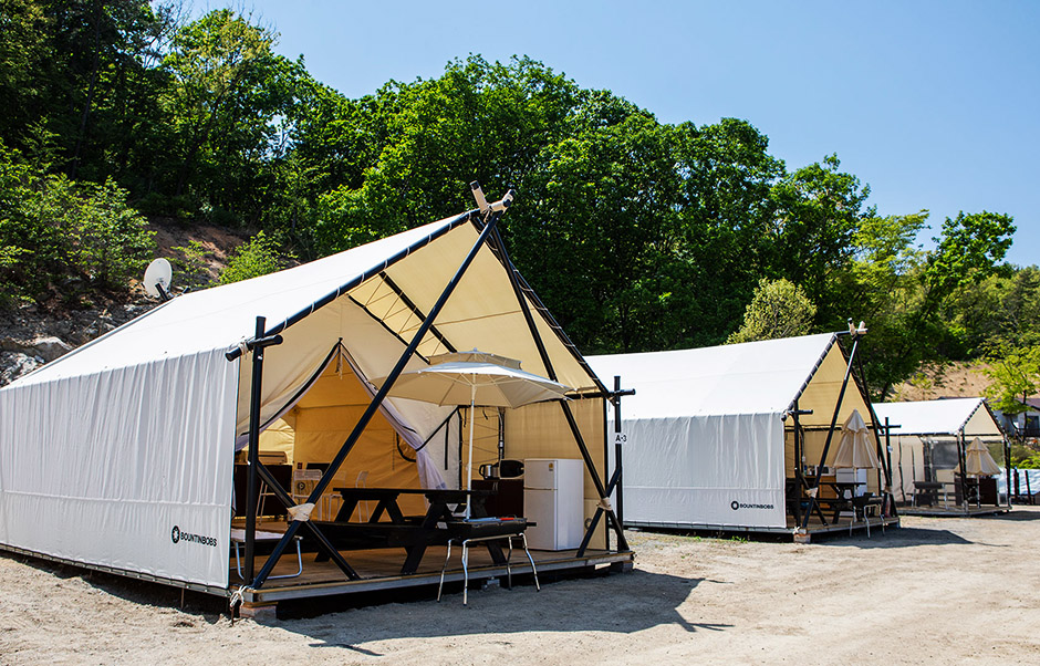하늘바다 글램핑은 2020년 8월에 오픈한 신축 글램핑장으로, 강화군 동검도에 자리 잡고 있다. 앞으로는 탁 트인 바다가, 뒤로는 병풍처럼 수려한 숲이 있어 아름답고 아늑한 풍광을 자랑한다. 특히 동검도는 환상적인 일출을 볼 수 있는 신비의 섬이다. 동검도 다리를 건너 아름다운 해안선 따라 매끄럽게 뻗어 있는 드라이브 코스는 이국적 풍경의 분위기를 자아내기도 한다. 운영하는 글램핑 텐트는 29.7㎡로 넓은 편이다. 매트리스형 원룸과 데크로 구성되어 있는데, 넓은 내부와 푹신한 매트리스, 소파와 에어컨, TV, 전기밥솥 등 캠핑에 필요한 모든 용품이 구비되어 있다. 텐트 앞에는 편하게 식사할 수 있는 나무 테이블과 야외 어닝, 바비큐 시설이 있다. 또한, 나무 데크에 냉장고와 전자레인지도 마련돼 있어 편한 동선으로 식사 준비를 할 수 있어 좋다. 여름에는 수영장을 운영하며, 아이들이 뛰어놀기 좋은 트램펄린 시설도 갖춰 있어 자녀를 동반한 가족 단위 여행객들도 많이 찾는 곳이다.