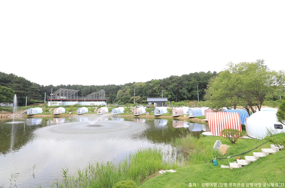 저수지 연안을 따라 돔 형태의 방갈로들이 들어서 있다. 돔방갈로는 다른 곳에는 없는 특이한 형태다. 그 앞으로 그늘막 텐트를 설치해 편하게 낚시를 즐길 수 있다. 방갈로 내부에는 2인용 침대를 비롯한 각종 편의 시설이 갖추어져 있다. 글램캠핑장이기때문에 식당은 별도로 없고 직접 취사를 해야 한다. 캠핑용 취사도구 세트를 무료로 대여해 준다.