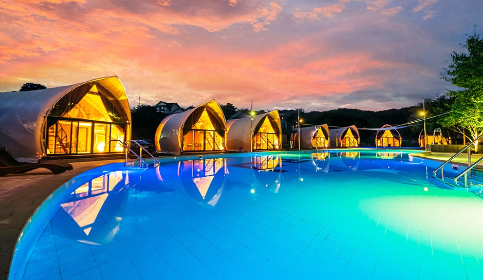사계절 내내 이용 가능한 온수 수영장과 독채로 운영되는 객실까지 호텔 같은 편안함을 추구하는 글램핑장이다. 텐트 앞을 관통하는 수영장, 텐트마다 설치된 100인치 스크린, 에어컨, 복층구조의 글램핑 객실은 캠핑이라기보다는 호텔에 가깝다. 저녁이면 다양한 조명으로 글램핑장의 또 다른 분위기를 느낄 수 있다. 숙소와 바비큐장이 분리되어 있어, 식사 후에도 숙소는 고기 냄새 없이 쾌적하다. 글램핑장에서 차로 5분 거리에 대형마트가 있어 식재료 등 쇼핑도 쉽다.