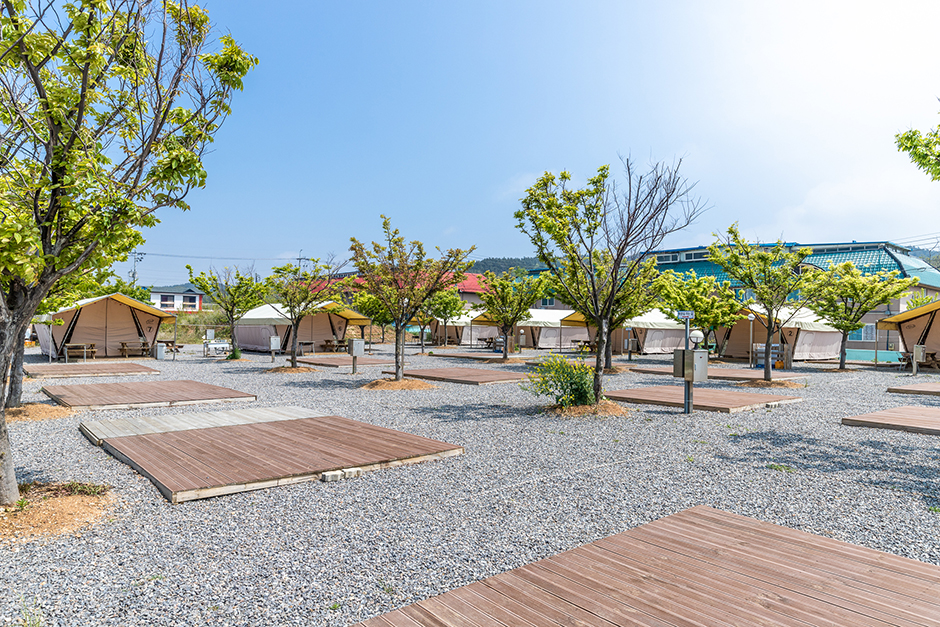 - 내용 : 전기,무선인터넷,장작판매,온수,트렘폴린,물놀이장,놀이터,운동장,운동시설