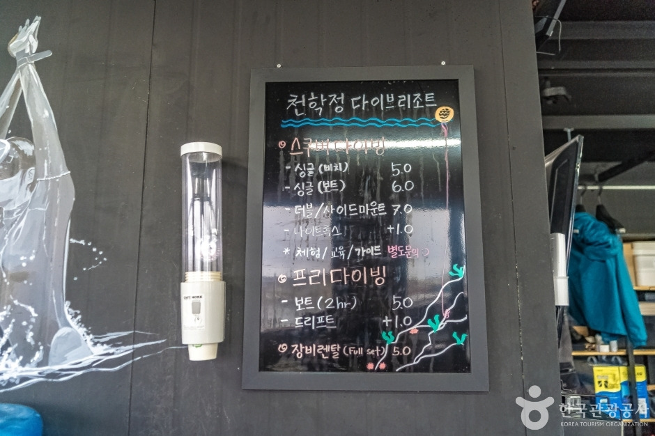 천학정다이브리조트는 강원도 청정지역의 맑고 깨끗한 수중환경을 편안하고 쾌적하게 다이버를 위한 휴식공간을 제공한다. 초보 교육부터 펀다이버까지 다양한 수심의 바다환경을 경험할 수 있는 많은 다이브포인트가 있다. 천학정다이브리조트는 숙소와 식당, 샤워 등 편의시설이 구비되어 있고, 교암포구 쪽에 천학정 본진 이라 불리는 배를 타고 다이빙 세팅을 위한 장소가 있다. 천학정 본진에는 탈의실은 있지만 실내 샤워장이 아닌 실외 샤워기가 설치되어 있어 다이빙 후 바닷물을 제거하는 정도로 사용할 수 있다.
