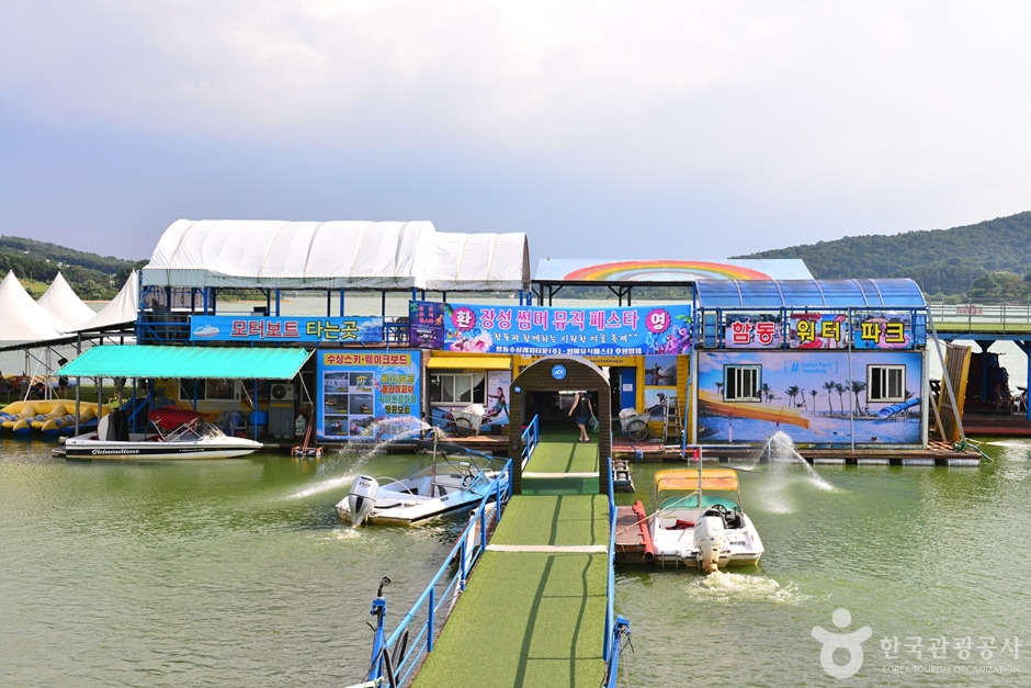 함동수상레저타운은 장성군 삼계면 함동 저수지에 위치한 수상레저타운이다. 수상스키, 웨이크보드, 플라이퓌쉬, 땅콩보트, 자이언트 마블, 디스코보트, 바나나보트 등 다양한 수상 레저 스포츠를 즐길 수 있다. 화려한 경력을 자랑하는 국내 최고 수상스키 국가대표와 웨이크보드의 우수한 강사진 등이 배치되어 있으며 스릴 만점의 대형 워터슬라이드, 브롬점프 외 무더위를 날려줄 다양한 놀이 기구를 완비하고 있다. 테이블, 구명조끼, 샤워실, 수건은 무료 제공되며 워터파크 이용 시 아쿠아슈즈를 필수로 착용하여야 한다. 또한 친구, 가족 등 단체 방문객들이 즐길 수 있는 넉넉한 바비큐존이 조성되어 있다.